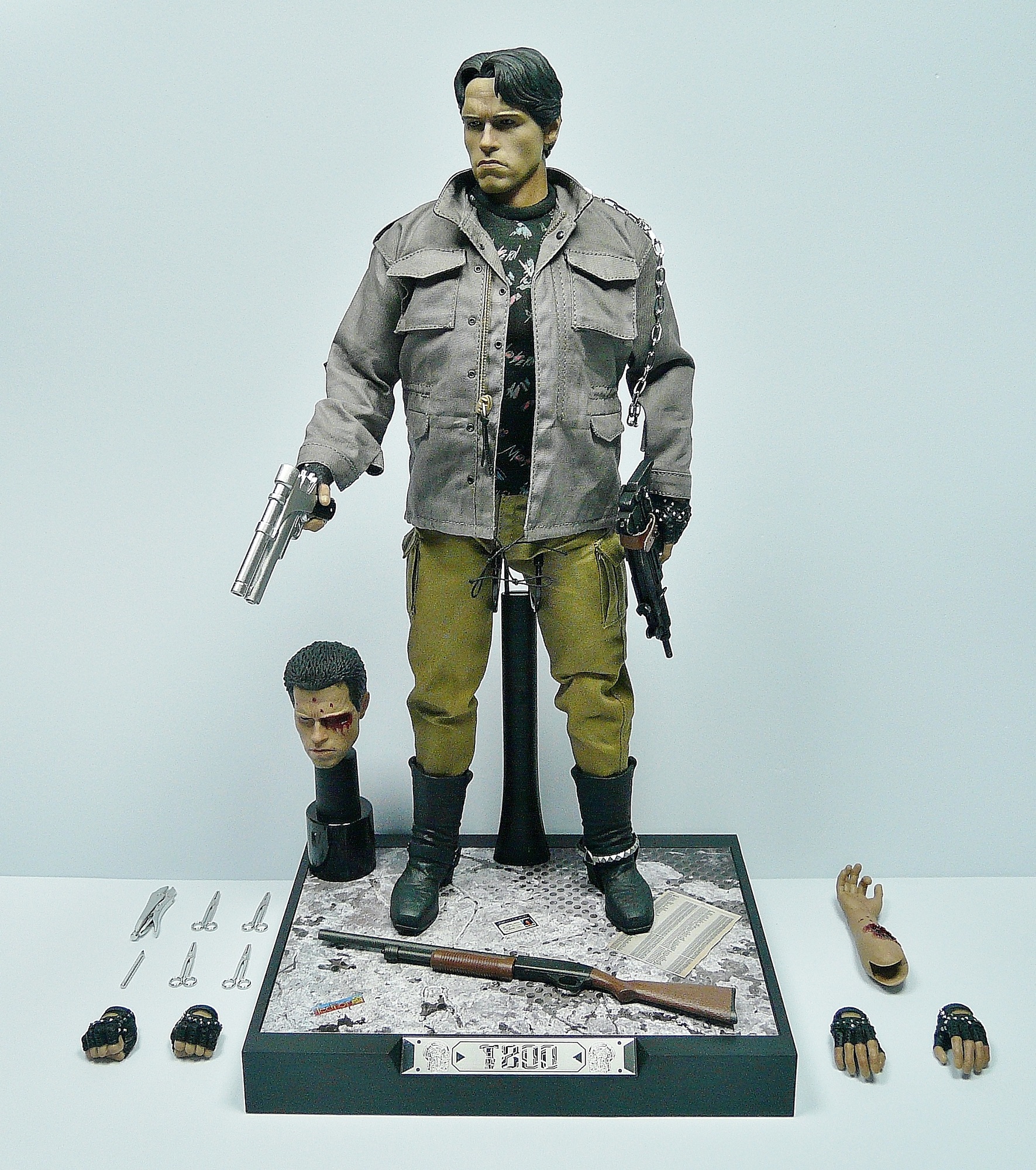 Nota: las tenazas, las cuatro tijeras y el bisturí son de autentico metal, la correa de la metralleta es de autentica piel. El carnet de la biblioteca, la entrada de la discoteca, la hoja de la guía telefónica, la cadena del hombro, el stand de la segunda cabeza y el cartel luminoso Tech-Noir no venían incluidos en la figuras, los he elaborado yo personalmente.
