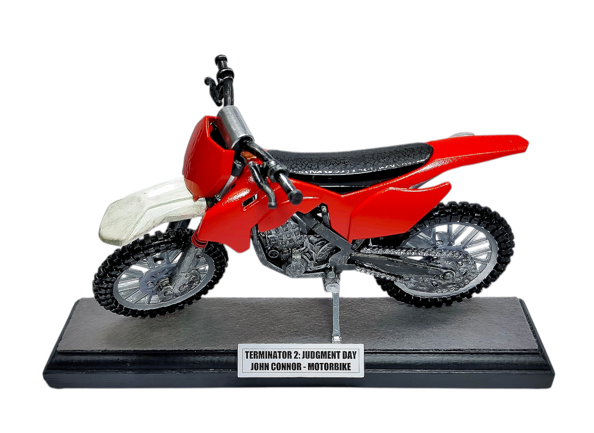 La he desmontado, le he añadido los amortiguadores delanteros, la he repintado por completo y le he añadido la peana con la placa para que se parezca todo lo posible a la que lleva John Connor en la segunda entrega de la saga Terminator. Que os parece el resultado final?.