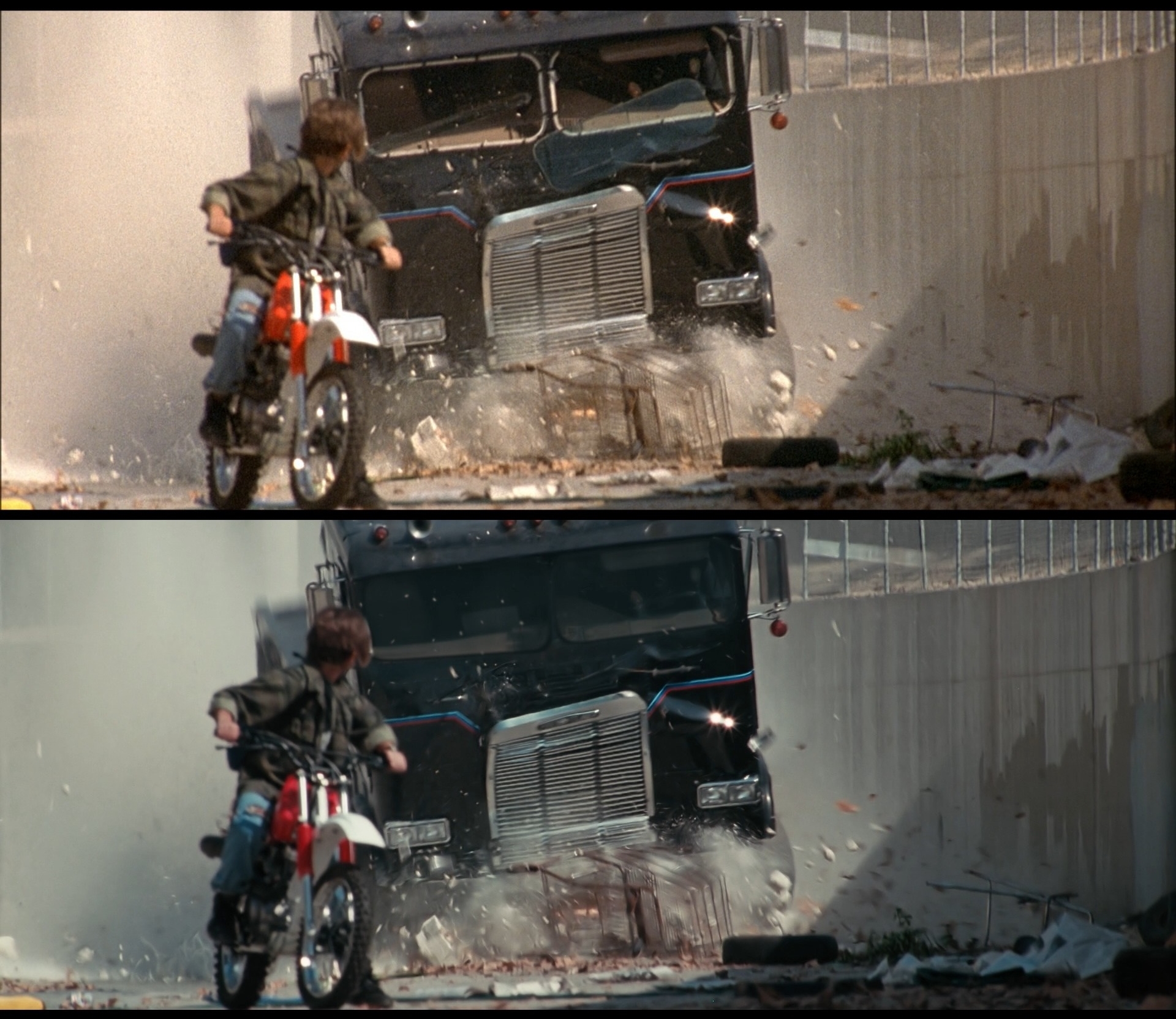 Y digo yo, ¿habrán corregido la rueda del camión cuando se queda totalmente partida por el eje al caer del puente?, luego en otro plano vemos como el camión va a toda pastilla, siempre me ha llamado la atención ese detalle en la peli.