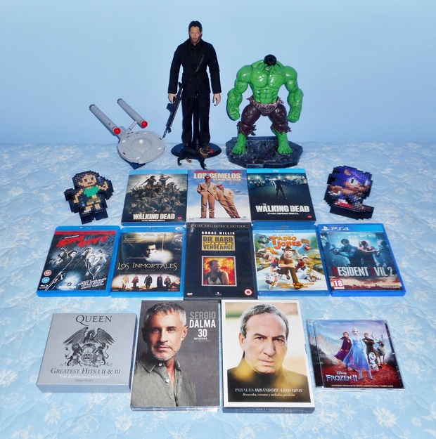 Aquí el resumen de compras de las últimas cuatro semanas: Las figuras de Pixels de Lara y Sonic una por 6€ y la otra por 9€, toda la sección de música a 5€ la pieza, y las dos temporadas de Walking Dead a 3€ cada una y la de Tadeo Jones también a 3€, todo ésto en Carrefour, la De Los Gemelos Golpean Dos Veces por 21,90€ y la de Sin City por 13,38€, ambas cosas en Amazon.es, la de Los Inmortales 5 por 3,45€ en Media Markt, la figura de John Wick 1/6 por 60€ en Wallapop, la figura de Hulk por 9,50€ en la tienda Disney, el perro para la figura de John Wick por 1,50€ y la Jungla 3 edición Inglesa en DVD también por 1,50€, ambas cosas en Dealz y por último la nave de Star Trek de Lego gratis de un sorteo de AliExpress y el juego de Resident Evil 2 regalo de un buen amigo.