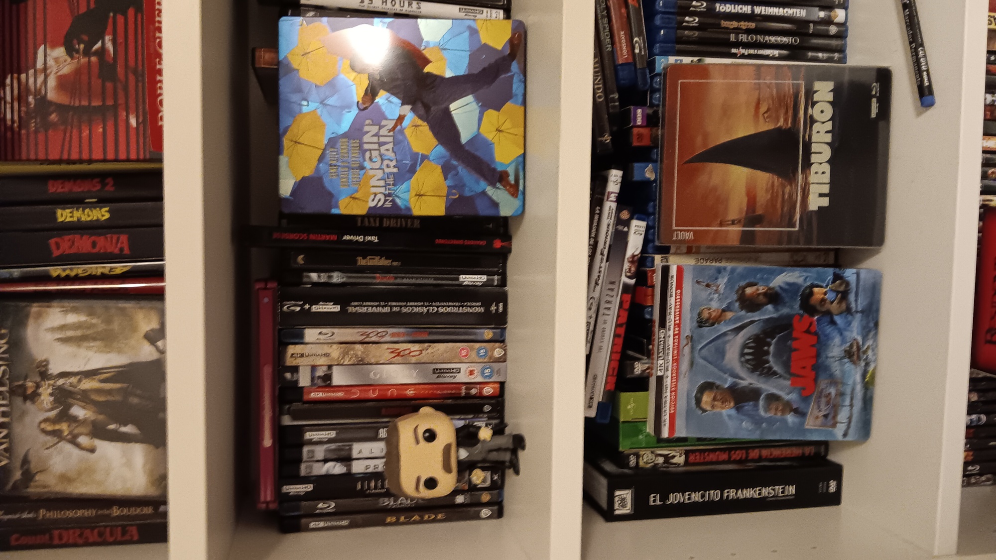 Yo tengo las mismas que tú a mí personalmente no me molesta que tenga las películas atrás tiene sus ventajas ejemplo no les da tan fácil el sol a las películas, de todas formas si no te gusta siempre puedes poner alguna figura delante es una idea tipo funko Pop.