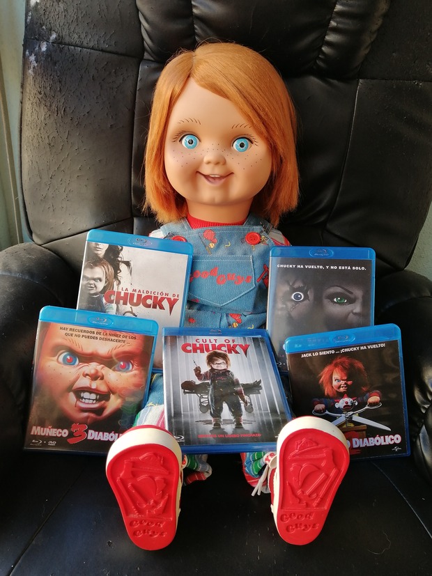 Aprovecho para felicitar a Chucky por su 34 cumpleaños. De paso, os dejo parte de mi colección en Bluray de nuestro icónico muñequito custodiada por alguien muy especial. Y tú, ¿Quieres jugar?