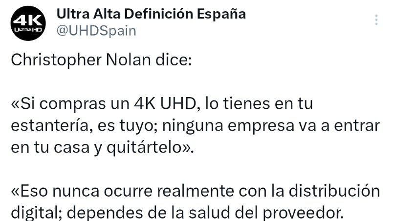 Nolan diría que si compras una película ( independientemente del formato ), es tuya, y no de la plataforma que la emita a su conveniencia.