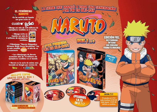 Pero ahora es una realidad, Selecta Visión pondrá a la venta el 25 de marzo de 2022 el Box 1 de Naruto en Blu-ray, un pack con funda y tres discos que incluirá los 25 primeros episodios de la serie y costará 39,99 €. Será el primero de 9 packs recopilatorios con los 220 capítulos.