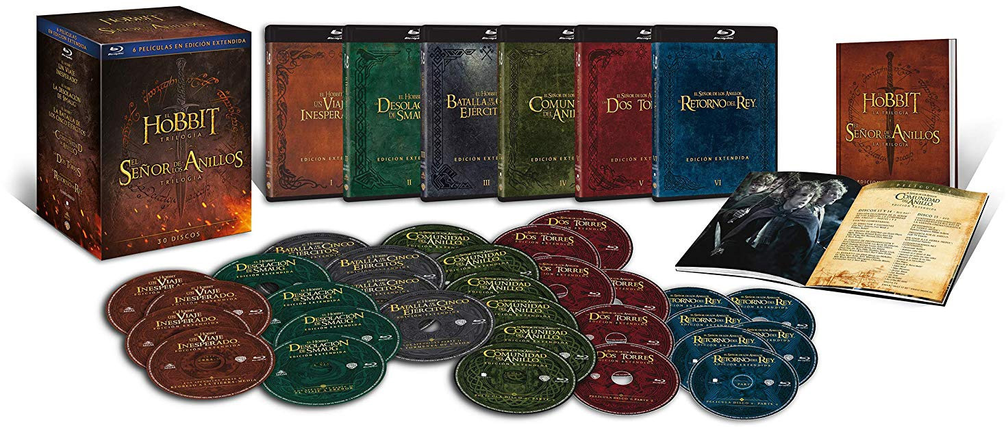 Pack recopilatorio con las 6 películas de la Tierra Media de Peter Jackson en su versión extendida y con todos los apéndices: El Señor de los Anillos: La Comunidad del Anillo, El Señor de los Anillos: Las Dos Torres, El Señor de los Anillos: El Retorno del Rey, El Hobbit: Un Viaje Inesperado, El Hobbit: La Desolación de Smaug y El Hobbit: La Batalla de los Cinco Ejércitos.